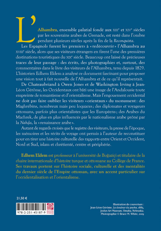 L’Alhambra, ensemble palatial fondé aux XIIIe et XIVe siècles par les souverains arabes de Grenade, est resté dans l’ombre pendant plusieurs siècles après la fin de la Reconquista. Les Espagnols furent les premiers à « redécouvrir » l’Alhambra au XVIIIe siècle, alors que ses visiteurs étrangers en firent l’une des premières destinations touristiques du XIXe siècle. Beaucoup ont laissé de précieuses traces de leur passage : des écrits, des photographies et, surtout, des commentaires dans le livre des visiteurs de l’Alhambra, tenu depuis 1829. L’historien Edhem Eldem a analysé ce document fascinant pour proposer une vision tout à fait nouvelle de l’Alhambra et de ce qu’il représentait. De Chateaubriand à Owen Jones et de Washington Irving à Jean-Léon Gérôme, les Occidentaux ont bâti une image de l’Andalousie toute empreinte de romantisme et d’orientalisme. Mais l’engouement occidental ne doit pas faire oublier les visiteurs « orientaux » du monument : des Maghrébins, nombreux mais peu loquaces ; des diplomates et voyageurs ottomans, parfois plus orientalistes que les Européens ; des Arabes du Machrek, de plus en plus influencés par le nationalisme arabe prôné par la Nahda, la « renaissance arabe ». Autant de regards croisés que le registre des visiteurs, la presse de l’époque, les mémoires et les récits de voyage ont permis à l’auteur de reconstituer pour en tirer une histoire culturelle des rapports entre Orient et Occident, Nord et Sud, islam et chrétienté, centre et périphérie.