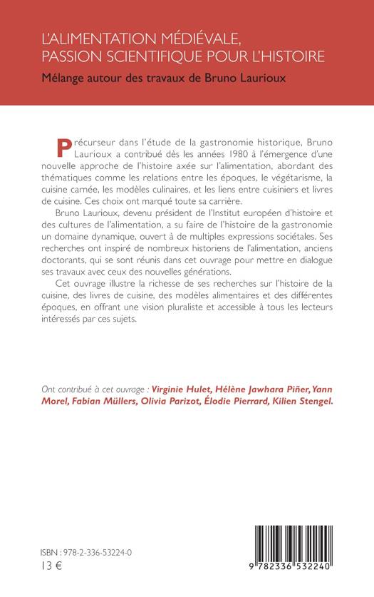Précurseur dans l'étude de la gastronomie historique, Bruno Laurioux a contribué dès les années 1980 à l'émergence d'une nouvelle approche de l'histoire axée sur l'alimentation, abordant des thématiques comme les relations entre les époques, le végétarisme, la cuisine carnée, les modèles culinaires, et les liens entre cuisiniers et livres de cuisine. Ces choix ont marqué toute sa carrière. Bruno Laurioux, devenu président de l'Institut européen d'histoire et des cultures de l'alimentation, a su faire de l'histoire de la gastronomie un domaine dynamique, ouvert à de multiples expressions sociétales. Ses recherches ont inspiré de nombreux historiens de l'alimentation, anciens doctorants, qui se sont réunis dans cet ouvrage pour mettre en dialogue ses travaux avec ceux des nouvelles générations. Cet ouvrage illustre la richesse de ses recherches sur l'histoire de la cuisine, des livres de cuisine, des modèles alimentaires et des différentes époques, en offrant une vision pluraliste et accessible à tous les lecteurs intéressés par ces sujets.