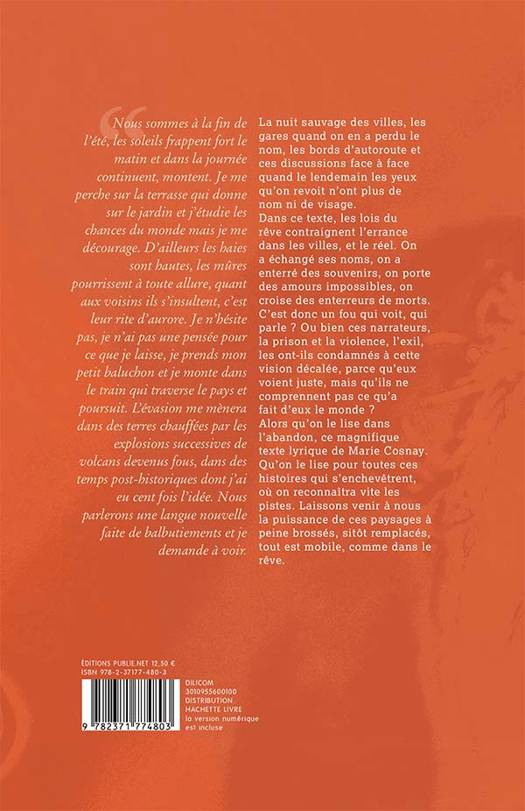 Nous sommes à la fin de l’été, les soleils frappent fort le matin et dans la journée continuent, montent. Je me perche sur la terrasse qui donne sur le jardin et j’étudie les chances du monde mais je me décourage. D’ailleurs les haies sont hautes, les mûres pourrissent à toute allure, quant aux voisins ils s’insultent, c’est leur rite d’aurore. Je n’hésite pas, je n’ai pas une pensée pour ce que je laisse, je prends mon petit baluchon et je monte dans le train qui traverse le pays et poursuit. L’évasion me mènera dans des terres chauffées par les explosions successives de volcans devenus fous, dans des temps post-historiques dont j’ai eu cent fois l’idée. Nous parlerons une langue nouvelle faite de balbutiements et je demande à voir.