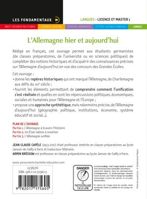 Cet ouvrage donne les repères historiques qui ont marqué le devenir de l'Allemagne de Charlemagne jusqu'à l'élection de septembre 2021, en passant par la chute du Mur de Berlin. Il fournit les éléments permettant de comprendre comment l'unification s'est réalisée et quelles en sont les répercussions politiques, économiques, sociales et humaines pour l'Allemagne et l'Europe. Il propose une approche synthétique, mais néanmoins précise, de l'Allemagne d'aujourd'hui et de demain à travers sa géographie politique, ses institutions, son économie, son système éducatif et social.