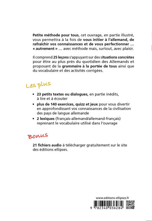 Petite méthode pour tous, cet ouvrage, en partie illustré, permet à la fois de s’initier à l’allemand, de rafraîchir ses connaissances et de se perfectionner… « autrement »… avec méthode mais surtout avec plaisir.