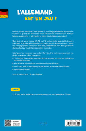 Quel que soit votre niveau (A1, A2 ou B1), mots croisés, quiz, petits textes à compléter à l’aide de l’audio, mots mêlés, jeux de lettres, oui-non… seront vos compagnons de révision de près de 30 éléments de base de la grammaire allemande !