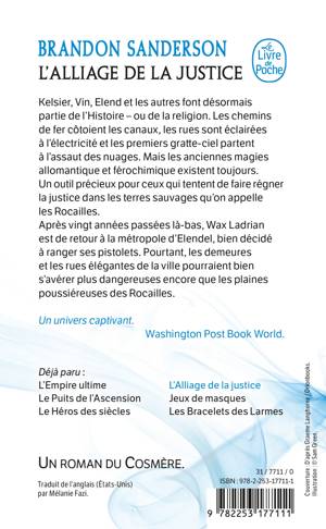 Kelsier, Vin, Elend et les autres font désormais partie de l’Histoire – ou de la religion. Les chemins de fer côtoient les canaux, les rues sont éclairées à l’électricité et les premiers gratte-ciel partent à l’assaut des nuages. Mais les anciennes magies allomantique et férochimique existent toujours. Un outil précieux pour ceux qui tentent de faire régner la justice dans les terres sauvages qu’on appelle les Rocailles. Après vingt ans là-bas, Wax Ladrian est de retour à la métropole d’Elendel, bien décidé à ranger ses pistolets. Pourtant les demeures et les rues élégantes de la ville pourraient bien s’avérer plus dangereuses encore que les plaines poussiéreuses des Rocailles.