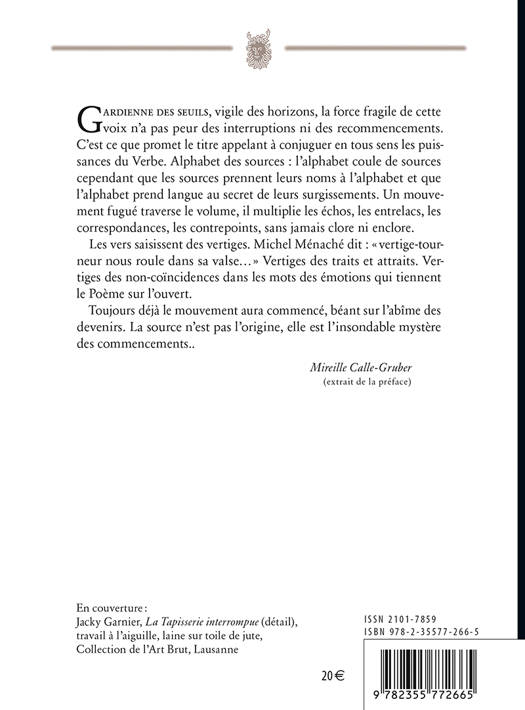 « La source n’est pas l’origine, elle est l’insondable mystère des commencements.. » Ce deuxième volume des Œuvres Poétiques de Michel Ménaché, restitue le parcours de 30 années de poésie (1965-1994). Le volume est préfacé par Mireille Calle-Gruber : « Gardienne des seuils, vigile des horizons, la force fragile de cette voix n’a pas peur des interruptions ni des recommencements. Un mouvement fugué traverse le volume, il multiplie les échos, les entrelacs, les correspondances, les contrepoints, sans jamais clore ni enclore. Les vers saisissent des vertiges des traits et attraits, vertiges des non-coïncidences dans les mots des émotions qui tiennent le Poème sur l’ouvert. La source n’est pas l’origine, elle est l’insondable mystère des commencements.. » Recueils publiés en larges extraits : Pavés et fenêtres (1965-1967), Crocs-accrocs (1981), Fable des matières (1981-1983), Célébration de l’oeuf (1992), La semaine des 40 haïkus (1991), Ascension du silence (1992), Goudron de nuit (1994), Claquemuraille (1985), Ectoplasme à plumes rouges et bonnet de nuit (1991).