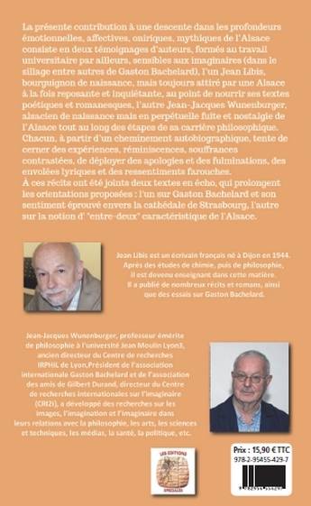 L'ouvrage co-écrit par Jean Libis et Jean-Jacques Wunenburger nous entraîne dans les profondeurs troublantes de l'Alsace. À travers leur vécu respectif les deux auteurs se plaisent à mêler imaginaire et réflexions philosophiques, dans le sillage de Gaston Bachelard. Nous découvrons ainsi à travers leurs récits autobiographiques toute ce qui confère sa singularité à cette région, de par son histoire et sa géographie. Deux textes prolongent leurs témoignages, l'un sur le vertige éprouvé par Gaston Bachelard envers la cathédrale de Strasbourg, l'autre sur la notion d' "entre-deux" caractéristique de l'Alsace.
