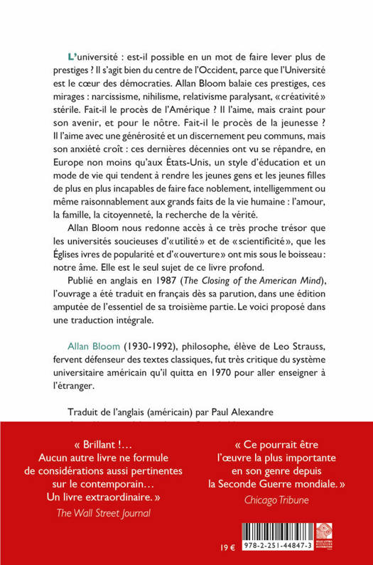 L'universite: est-il possible en un mot de faire lever plus de prestiges ? Il s'agit bien du centre de l'Occident, parce que l'Universite est le coeur des democraties. Allan Bloom balaie ces prestiges, ces mirages: narcissisme, nihilisme, relativisme paralysant, creativite sterile. Fait-il le proces de l'Amerique ? Il l'aime, mais craint pour son avenir, et pour le notre. Fait-il le proces de la jeunesse ? Il l'aime avec une generosite et un discernement peu communs, mais son anxiete croit: ces dernieres decennies ont vu se repandre, en Europe non moins qu'aux Etats-Unis, un style d'education et un mode de vie qui tendent a rendre les jeunes gens et les jeunes filles de plus en plus incapables de faire face noblement, intelligemment ou meme raisonnablement aux grands faits de la vie humaine: l'amour, la famille, la citoyennete, la recherche de la verite. Allan Bloom nous redonne acces a ce tres proche tresor que les universites soucieuses d' utilite et de scientificite , que les Eglises ivres de popularite et d' ouverture ont mis sous le boisseau: notre ame. Elle est le seul sujet de ce livre profond. Publie en anglais en 1987 (The Closing of the American Mind), l'ouvrage a ete traduit en francais des sa parution, dans une edition amputee de l'essentiel de sa troisieme partie. Le voici propose dans une traduction integrale.