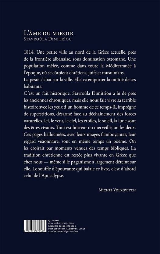 1814. Une petite ville au nord de la Grèce actuelle, près de la frontière albanaise, sous domination ottomane. Une population mêlée, comme dans toute la Méditerranée à l’époque, où se côtoient chrétiens, juifs et musulmans. La peste s’abat sur la ville. Elle va emporter la moitié de ses habitants. C’est un fait historique. Stavroùla Dimitrìou a lu de près les anciennes chroniques, mais elle nous fait vivre sa terrible histoire avec les yeux d’un homme de ce temps-là, imprégné de superstitions, désarmé face au déchaînement des forces naturelles. Ici, le vent, le ciel, les étoiles, le soleil, la lune sont des êtres vivants. Tout est horreur ou merveille, ou les deux. Ces pages hallucinées, avec leurs images flamboyantes, leur regard visionnaire, sont en même temps un poème. On les croirait par moments venues des temps bibliques. La tradition chrétienne est restée plus vivante en Grèce que chez nous — même si le paganisme a largement déteint sur elle. Le souffle d’épouvante qui balaie ce livre, c’est d’abord celui de l’Apocalypse.