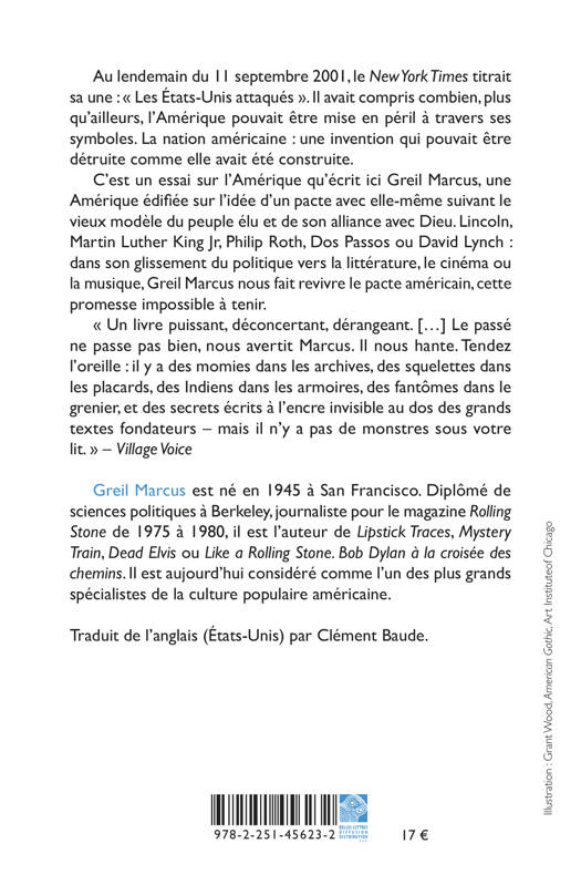 C’est un essai sur l’Amérique qu’écrit ici Greil Marcus, une Amérique édifiée sur l’idée d’un pacte avec elle-même suivant le vieux modèle du peuple élu et de son alliance avec Dieu. Lincoln, Martin Luther King Jr, Philip Roth, Dos Passos ou David Lynch : dans son glissement du politique vers la littérature, le cinéma ou la musique, Greil Marcus nous fait revivre le pacte américain, cette promesse impossible à tenir.