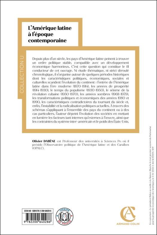 e siècle à nos jours, constitue le fil conducteur de cet ouvrage. Ni étude thématique, ni strict suivi chronologique, il s’organise autour de quelques périodes historiques dont les caractéristiques politiques, économiques, sociales et culturelles scandent l’évolution du continent. Ainsi sont examinés l’entrée de l’Amérique latine dans l’ère moderne (1870-1914), les années de prospérité (1914-1930), le temps du populisme (1930-1950), le séisme de la révolution cubaine (1950-1970), les années sombres (1968-1979), les transformations politiques et économiques des années 1980 et 1990, les caractéristiques contradictoires du tournant du siècle et, enfin, l’instabilité et la radicalisation politiques actuelles.