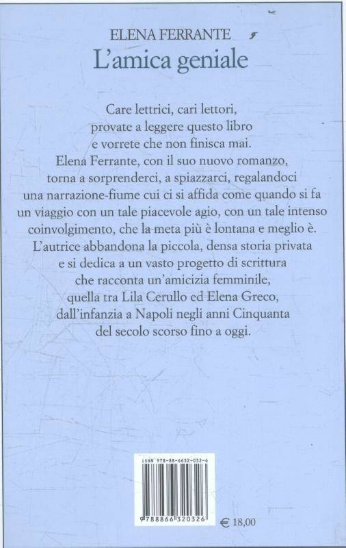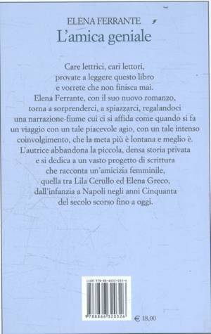 Il romanzo comincia seguendo le due protagoniste bambine, e poi adolescenti, tra le quinte di un rione miserabile della periferia napoletana, tra una folla di personaggi minori accompagnati lungo il loro percorso con attenta assiduità. L'autrice scava nella natura complessa dell'amicizia tra due bambine, tra due ragazzine, tra due donne, seguendo la loro crescita individuale, il modo di influenzarsi reciprocamente, i buoni e i cattivi sentimenti che nutrono nei decenni un rapporto vero, robusto. Narra poi gli effetti dei cambiamenti che investono il rione, Napoli, l'Italia, in più di un cinquantennio, trasformando le amiche e il loro legame. E tutto ciò precipita nella pagina con l'andamento delle grandi narrazioni popolari, dense e insieme veloci, profonde e lievi, rovesciando di continuo situazioni, svelando fondi segreti dei personaggi, sommando evento a evento senza tregua, ma con la profondità e la potenza di voce a cui l'autrice ci ha abituati. Si tratta di quel genere di libro che non finisce. O, per dire meglio, l'autrice porta compiutamente a termine in questo primo romanzo la narrazione dell'infanzia e dell'adolescenza di Lila e di Elena, ma ci lascia sulla soglia di nuovi grandi mutamenti che stanno per sconvolgere le loro vite e il loro intensissimo rapporto.