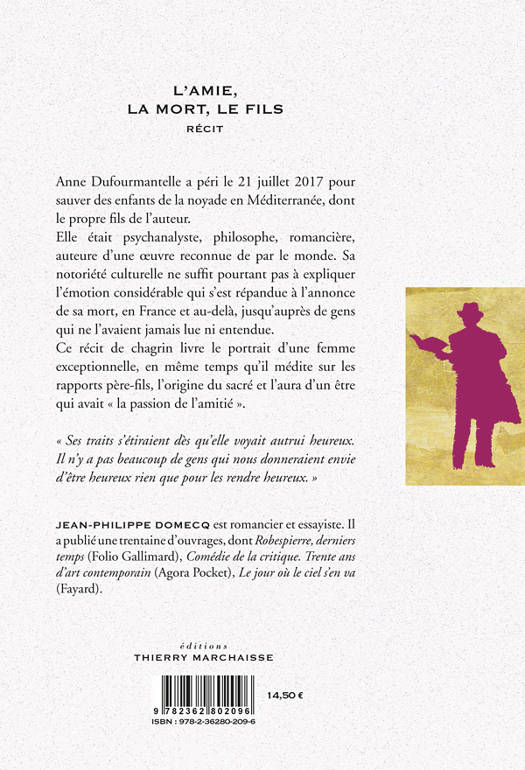 Anne Dufourmantelle a péri le 21 juillet 2017 pour sauver des enfants de la noyade en Méditerranée, dont le propre fils de l'auteur.<br /><br /><br /><br /> Elle était psychanalyste, philosophe, romancière, auteure d'une oeuvre reconnue de par le monde. Sa notoriété culturelle ne suffit pourtant pas à expliquer l'émotion considérable qui s'est répandue à l'annonce de sa mort, en France et au-delà, jusqu'auprès de gens qui ne l'avaient jamais lue ni entendue.<br /><br /><br /><br /> Ce récit de chagrin livre le portrait d'une femme exceptionnelle, en même temps qu'il médite sur les rapports père-fils, l'origine du sacré et l'aura d'un être qui avait « la passion de l'amitié ».<br /><br /><br /><br /> « Ses traits s'étiraient dès qu'elle voyait autrui heureux. Il n'y a pas beaucoup de gens qui nous donneraient envie d'être heureux rien que pour les rendre heureux. »<br /><br /><br /><br /> Jean-Philippe DOMECQ est romancier et essayiste. Il a publié une trentaine d'ouvrages, dont Robespierre, derniers temps (Folio Gallimard), Comédie de la critique. Trente ans d’art contemporain (Agora Pocket), Le jour où le ciel s’en va (Fayard).
