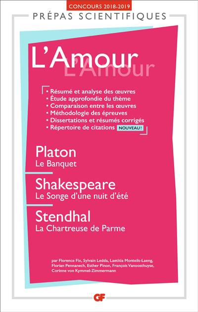 Cet ouvrage s'adresse aux élèves des classes préparatoires aux grandes écoles scientifiques. Il a pour objectif de les aider à réussir l'épreuve littéraire des concours.Pour l'année 2018-2019, le programme porte sur : - Platon, Le Banquet- Shakespeare, Le Songe d'une nuit d'été- Stendhal, La Chartreuse de ParmeLe thème associé à ces oeuvres est : L'amour.Complet et précis, ce livre est l'outil indispensable à une meilleure connaissance des oeuvres et du thème. Il comprend : 1. Une introduction générale qui situe le thème dans l'histoire de la pensée et analyse les différentes problématiques qu'il recouvre ;2. Trois études détaillées : - pour se familiariser avec chacune des oeuvres au programme : résumé et structure, analyse du contexte, fiches thématiques ;- pour comprendre comment chacune aborde et illustre le thème au programme ;3. Une réflexion synthétique et problématisée sur le thème "L'amour" à partir des oeuvres étudiées ;4. Une méthodologie de la dissertation et du résumé, des dissertations et des résumés corrigés, un index des notions qui se rattachent au thème et un répertoire de citations commentées.
