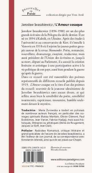 On a rassemblé ici des poèmes représentatifs de différents recueils publiés depuis 1919. L’Amour cosaque est un de ces poèmes : souvenir de la jeunesse ukrainienne de Jaroslaw Iwaszkiewicz sans aucun doute, et qui reflète assez bien la sensibilité du poète, sensibilité tourmentée, capricieuse, insoumise, humble seulement devant le mystère.