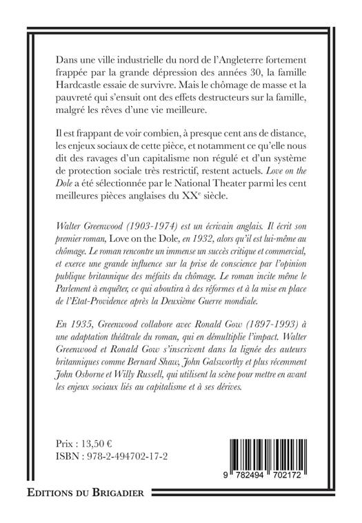 Dans une ville industrielle du nord de l’Angleterre fortement frappée par la grande dépression des années 30, la famille Hardcastle essaie de survivre. Mais le chômage de masse et la pauvreté qui s’ensuit ont des effets destructeurs sur la famille, malgré les rêves d'une vie meilleure. Il est frappant de voir combien, à presque cent ans de distance, les enjeux sociaux de cette pièce, et notamment ce qu'elle nous dit des ravages d'un capitalisme non régulé et d'un système de protection sociale très restrictif, restent actuels. Love on the Dole a été sélectionné par le National Theater parmi les cent meilleures pièces anglaises du XXe siècle.