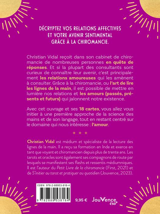 Avec cet ouvrage et à ses 18 cartes, vous allez donc vous initier à une première approche de la science des mains et de son langage, tout en restant centré sur le domaine qui nous intéresse : l’amour.