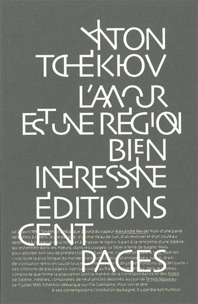 L’Amour est une région bien intéressante. Originale en diable. Elle grouille d’une vie dont on a même pas idée en Europe. Le 23 avril 1890, Tchékhov embarque à bord du vapeur Alexandre-Nevski muni d’une paire de bottes à revers, d’une pelisse, d’un manteau de cuir, d’un revolver et d’un couteau destiné à couper le saucisson et à chasser le tigre. Il part à la recherche d’une Sibérie qui est entrée dans les mœurs, dans les usages: la Sibérie terre de bagne. Mais pour aborder son lieu de prédilection, l’île de Sakhaline, il lui faut prendre le trakt sibérien – la route la plus longue du monde, mais aussi la plus scandaleuse, ruban, drain de civilisation remis en cause tous les printemps par le dégel. Les horizons qu’il découvre, le tableau composite que forme la population sont la matière de la Correspondance et des Notes de Sibérie, inédites, composées de neuf articles destinés au journal Temps nouveau. Le 11 juillet 1890, Tchékhov débarque sur l’île de Sakhaline.
