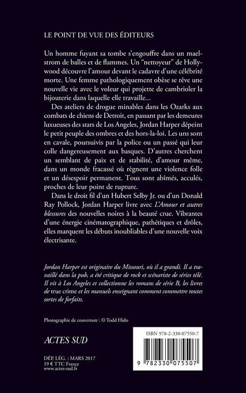 Un homme fuyant sa tombe s'engouffre dans un maelstrom de balles et de flammes. Un "nettoyeur" de Hollywood découvre l'amour devant le cadavre d'une célébrité morte. Une femme pathologiquement obèse se rêve une nouvelle vie avec le voleur qui projette de cambrioler la bijouterie dans laquelle elle travaille... Des ateliers de drogue minables dans les Ozarks aux combats de chiens de Detroit, en passant par les demeures luxueuses des stars de Los Angeles, Jordan Harper dépeint le petit peuple des ombres et des hors-la-loi. Les uns sont en cavale, poursuivis par la police ou un passé qui leur colle dangereusement aux basques. D'autres cherchent un semblant de paix et de stabilité, d'amour même, dans un monde fracassé où règnent une violence folle et un désespoir permanent. Tous sont abîmés, acculés, proches de leur point de rupture. Dans le droit fil d'un Hubert Selby Jr. ou d'un Donald Ray Pollock, Jordan Harper livre avec L'«Amour et autres blessures» des nouvelles noires à la beauté crue. Vibrantes d'une énergie cinématographique, pathétiques et drôles, elles marquent les débuts inoubliables d'une nouvelle voix électrisante.