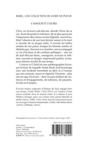 Chris, un écrivain sud-africain, aborde l'hiver de sa vie. Avant de perdre la mémoire, de ne plus percevoir l'importance des choses ou leur légèreté, avant d'oublier l'absence de son tout dernier amour et la mort si récente de sa propre mère, il revisite les belles années de son passé, évoque les femmes aimées et désirées qui, chacune à sa manière, ont accompagné sa vie d'écriture et de combats politiques - une vie de Sud-Africain blanc, enseignant, écrivain et militant, souvent en danger, emprisonné parfois, et toujours témoin révolté de son temps. L'Amour et l'Oubli est une autobiographie fictive, par le biais de laquelle André Brink rend hommage avec une évidente honnêteté au désir et à l'amour qui ont construit, nourri et régénéré l'homme - plus encore que l'écrivain - dans un pays brûlant de violences et d'engagements, de trahisons, de passions, d'exils et d'utopies.