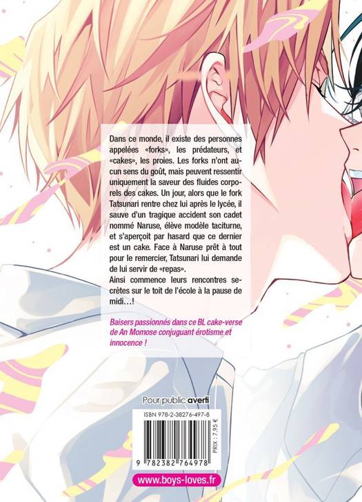 Dans ce monde, il existe des personnes appelées "forks", les prédateurs, et "cakes", les proies. Les forks n'ont aucun sens du goût, mais peuvent ressentir uniquement la saveur des fluides corporels des cakes. Un jour, alors que le fork Tatsunari rentre chez lui après le lycée, il sauve d'un tragique accident son cadet nommé Naruse, élève modèle taciturne, et s'aperçoit par hasard que ce dernier est un cake. Face à Naruse prêt à tout pour le remercier, Tatsunari lui demande de lui servir de "repas". Ainsi commence leurs rencontres secrètes sur le toit de l'école à la pause de midi...! Baisers passionnés dans ce BL cake-verse de An Momose conjuguant érotisme et innocence !