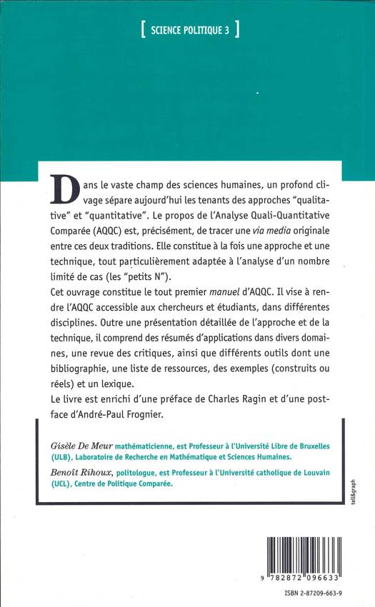 Cet ouvrage vise à rendre accessible l'analyse quali-quantitative comparée (traduction non littérale de "Qualitative Comparative Analysis" (QCA)). L'analyse QCA tente de dégager une via media originale entre les deux approches actuellement dominantes: qualitative et quantitative. Elle est particulièrement bien adaptée pour analyser systématiquement un nombre assez faible de cas (de quelques-uns à quelques dizaines), et se prête à des applications dans de nombreuses disciplines des sciences humaines.
