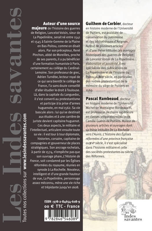 Auteur d’une source majeure de l’histoire des guerres de Religion, Lancelot Voisin, sieur de La Popelinière, serait né entre 1541 et 1545 à Sainte-Gemme de la Plaine en Bas-Poitou, comme on disait alors. Par son précepteur, René Pinchon, abbé de Moreilles, proche de ses parents, il a pu bénéficier d’une formation humaniste à Paris, certainement au collège du Cardinal-Lemoine. Son professeur de grec, Adrien Turnèbe, lecteur royal de ce qui sera bientôt le collège de France, l’a sans doute conseillé d’aller étudier le droit à Toulouse. Là, dans la capitale du Languedoc, il s’est converti au protestantisme et participe à la prise d’armes huguenote, en mai 1562. Sa vie bascule alors : lui qui se destinait aux études et à une carrière de juriste devient capitaine huguenot. Ces deux aspects, le militaire et l’intellectuel, articulent ensuite toute sa vie : il est tour à tour diplomate, historien, corsaire, capitaine de compagnies et gouverneur de places stratégiques. Son ancrage rochelais, à partir de 1574, n’empêche pas que son ouvrage phare, L’Histoire de France, soit condamné par les Églises réformées du royaume, réunies en synode à La Rochelle. Novateur, intelligent et d’une grande hauteur de vue, La Popelinière, personnage assez méconnu, mène une vie riche et trépidante jusqu’en 1608.