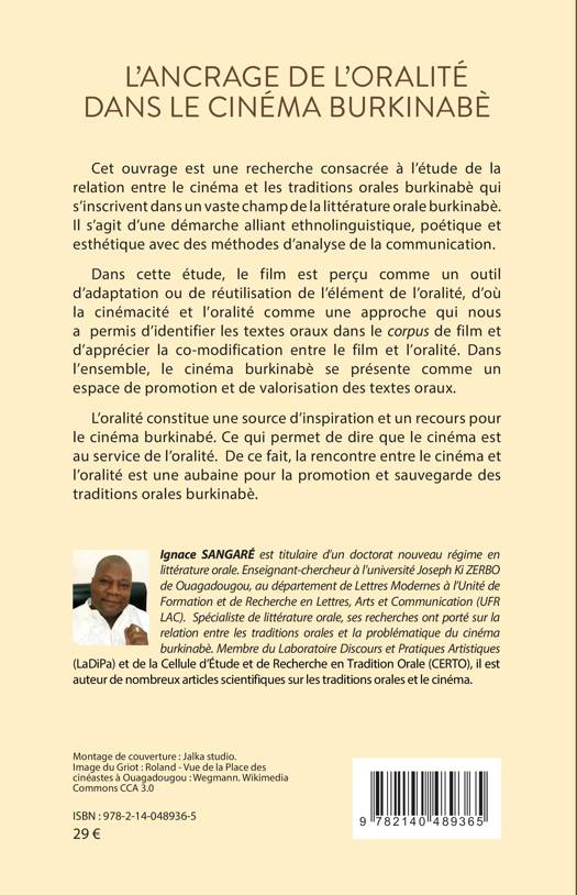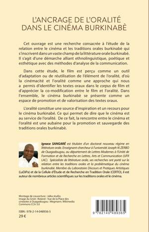 Cet ouvrage est une recherche consacrée à l'étude de la relation entre le cinéma et les traditions orales burkinabè qui s'inscrivent dans un vaste champ de la littérature orale burkinabè. Il s'agit d'une démarche alliant ethnolinguistique, poétique et esthétique avec des méthodes d'analyse de la communication. Dans cette étude, le film est perçu comme un outil d'adaptation ou de réutilisation de l'élément de l'oralité. Dans l'ensemble, le cinéma burkinabè se présente comme un espace de promotion et de valorisation des textes oraux. L'oralité constitue une source d'inspiration et un recours pour le cinéma burkinabé. Ce qui permet de dire que le cinéma est au service de l'oralité. De ce fait, la rencontre entre le cinéma et l'oralité est une aubaine pour la promotion et sauvegarde des traditions orales burkinabè.