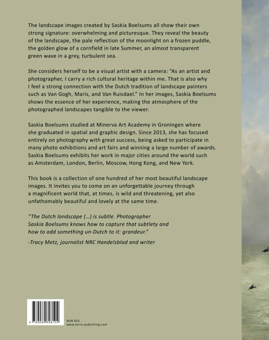 -Powerfully atmospheric landscape photographs inspired by the heritage of Dutch Old Master paintings The dramatic landscape photographs of Saskia Boelsums manifest a strong connection to the Dutch tradition of landscape paintings. She is inspired by nature, weather, and the seasons, with clouds and skies characterized by moody chiaroscuro and painterly monumentality. The reality of the changing climate, and what this will mean for the future, is a theme that runs throughout her work. She captures not only the beauty of the landscape, but also a vague sense of uncertainty and threat. As she says: "It looks like the classic historical Dutch landscapes and skies are being pushed out by landscapes and skies that are the result of climate change. I am very aware of that tension." "I am photographing when most people think the weather is too bad to go outside. By exploring different landscapes in all four seasons, I feel strongly connected to the universe. That feeling I'm trying to pass on through my landscape photos." - Saskia Boelsums.