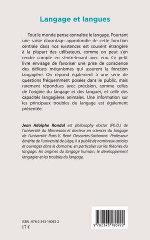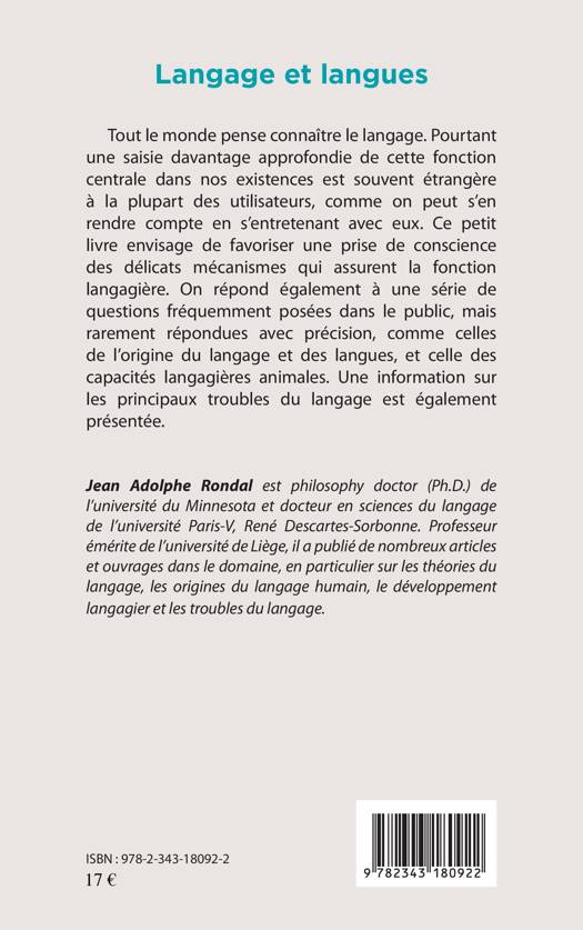Tout le monde pense connaître le langage. Pourtant une saisie davantage approfondie de cette fonction centrale dans nos existences est souvent étrangère à la plupart des utilisateurs, comme on peut s'en rendre compte en s'entretenant avec eux. Ce petit livre envisage de favoriser une prise de conscience des délicats mécanismes qui assurent la fonction langagière. On répond également à une série de questions fréquemment posées dans le public, mais rarement répondues avec précision, comme celles de l'origine du langage et des langues et celle des capacités langagières animales. Une information sur les principaux troubles du langage est également présentée.