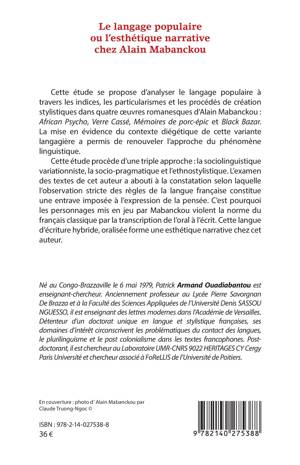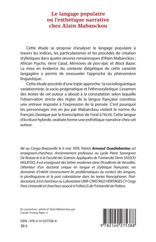Cette étude se propose d'analyser le langage populaire à travers les indices, les particularismes et les procédés de création stylistiques dans quatre oeuvres romanesques d'Alain Mabanckou: African Psycho, Verre Cassé, Mémoires de porc-épic et Black Bazar. La mise en évidence du contexte diégétique de cette variante langagière a permis de renouveler l'approche du phénomène linguistique. Cette étude procède d'une triple approche: la sociolinguistique variationniste, la socio-pragmatique et l'ethnostylistique. L'examen des textes de cet auteur a abouti à la constatation selon laquelle l'observation stricte des règles de la langue française constitue une entrave imposée à l'expression de la pensée. C'est pourquoi les personnages mis en jeu par Mabanckou violent la norme du français classique par la transcription de l'oral à l'écrit. Cette langue d'écriture hybride, oralisée forme une esthétique narrative chez cet auteur.