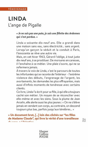 Linda a soixante-dix-neuf ans. Elle a grandi dans une maison sans eau, sans électricité… sans argent. Lorsqu’un garçon la séduit et la conduit à Paris, l’innocente se rêve une autre vie. Mais, en cet hiver 1963, Gérard l’oblige, à tout juste dix-neuf ans, à se prostituer. De morsures en caresses, il l’enchaîne à ce métier. Une plaie s’ouvre, qui ne se refermera jamais. À travers la voix de Linda, c’est le parcours de toutes les infortunées qui se raconte de l’intérieur – l’extrême violence des débuts, l’engrenage de l’argent, les avortements, les demandes les plus effrayantes, mais aussi d’infinis moments de tendresse avec certains clients. Ce livre, Linda l’a écrit pour sa fille, à qui elle a toujours caché son métier. Un moyen de se réconcilier avec elle-même et avec les siens. Sous la plume de Jean Arcelin, elle alerte aussi les plus jeunes : « On ne s’élève jamais en vendant son corps, au contraire, on descend toujours plus bas, parfois jusqu’aux ténèbres… »