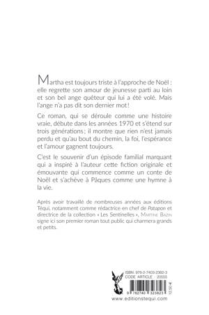 Lorsque Martha rencontre Henry-Ange à la chorale de sa paroisse, elle espère secrètement que leurs projets se rejoindront , mais le destin du jeune homme le conduit en Afrique où, devenu prêtre missionnaire, il se dévoue sans compter auprès de petits orphelins. Avant de partir, il a offert à Martha un « ange quêteur » : de la tête, l'ange fait un gracieux « merci » lorsqu'une obole est déposée dans la vasque qu'il tient à deux mains... Vingt ans plus tard, la statue, que Martha avait enfermée de désespoir dans son grenier, est volée par un brocanteur indélicat. L'ange quêteur, cependant, n'a pas dit son dernier mot. Ce roman se déroule comme une histoire vraie qui s'étend sur trois générations , elle montre que rien n'est jamais perdu et qu'au bout du chemin, la foi, l'espérance et l'amour gagnent toujours. L'auteur s'est inspirée d'un fait réel qu'elle a vécu dans les années 1970 pour écrire cette fiction originale et émouvante. A propos de l'auteur : Martine Bazin a travaillé de nombreuses années aux éditions Téqui, notamment comme rédactrice en chef de Patapon et directrice de la collection « Les Sentinelles ». Auteur chrétien et mère de famille, elle a écrit des histoires pour les enfants, par exemple les 4 Monette, Saint Michel, Notre petit Bon Dieu dans la collection « Les Petits Pâtres », ainsi que des contes de Noël (chez Téqui, Mediaspaul, Le Triomphe).