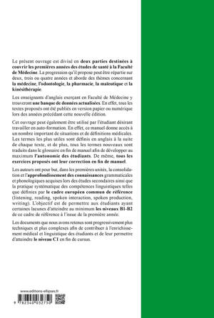 Le présent ouvrage est divisé en deux parties destinées à couvrir les premières années des études de santé à la Faculté de Médecine. Il peut être utilisé en PACES ou à partir de PC2 pour les Facultés qui n'enseignent pas l'anglais dès la première année. La progression qu'il propose peut être répartie sur deux, trois ou quatre années et aborde des thèmes concernant la médecine, l'odontologie, la pharmacie, la maïeutique et la kinésithérapie.