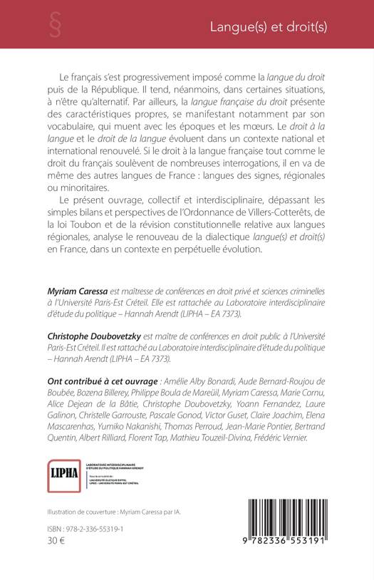 Le français s'est progressivement imposé comme la langue du droit puis de la République. Il tend, néanmoins, dans certaines situations, à n'être qu'alternatif. Par ailleurs, la langue française du droit présente des caractéristiques propres, se manifestant notamment par son vocabulaire, qui muent avec les époques et les moeurs. Le droit à la langue et le droit de la langue évoluent dans un contexte national et international renouvelé. Si le droit à la langue française tout comme le droit du français soulèvent de nombreuses interrogations, il en va de même des autres langues de France: langues des signes, régionales ou minoritaires. Le présent ouvrage, collectif et interdisciplinaire, dépassant les simples bilans et perspectives de l'Ordonnance de Villers-Cotterêts, de la loi Toubon et de la révision constitutionnelle relative aux langues régionales, analyse le renouveau de la dialectique langue(s) et droit(s) en France, dans un contexte en perpétuelle évolution.
