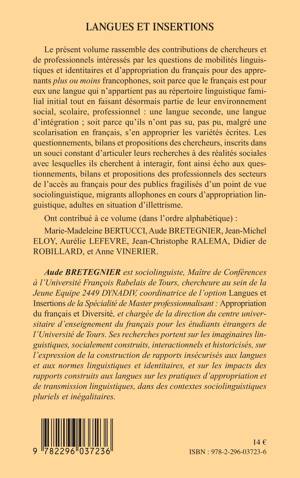 Issu d'une rencontre entre professionnels et (socio)linguistes autour des notions de langues, insertions, formations, ce recueil s'intéresse aux questions de mobilités linguistiques et identitaires d'appropriation du français pour des apprenants fragilisés d'un point de vue sociolinguistique, migrants allophones ou adultes en situation d'illettrisme.