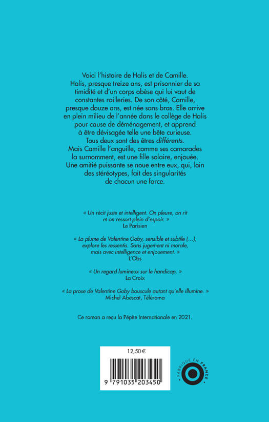 Camille est née sans bras. Avant son déménagement cela ne posait de problème à personne mais dans ce nouveau collège, le regard des autres ne la quitte plus. C'est vrai qu'elle est impressionnante avec sa bouche et ses pieds d'une rare dextérité. Quand ils la voient nager comme un poisson, ses camarades n'en croient pas leurs yeux. Enfin, acceptée, l'enthousiasme de Camille l'anguille va gagner Halis, cet élève que l'on chahute à cause de son poids. Une magnifique réécriture de «Murène» par Valentine Goby qui traite du handicap et de la différence avec humour et intelligence.