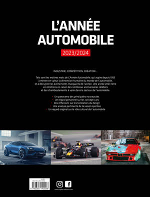 Partie 1 - INDUSTRIE (- ÉCONOMIE : étude des marchés mondiaux - PRODUCTION : rétrospective des principales nouveautés présentées - CRÉATION : sélection toujours plus large de concept-cars.) Partie 2 - SPORT AUTOMOBILE - Monoplace - Endurance - Rallyes - Championnats secondaires Chaque formule fait l’objet d’une analyse des forces en présence, d’un résumé de chaque épreuve avec leurs classements, et d’une synthèse de la saison. Partie 3 - CULTURE Elle souligne les influences réciproques entre l’automobile et la société. Objet culte, l’automobile fascine les artistes, stimule les artisans, sensibilise les architectes, attire les collectionneurs et occasionne ainsi mille rencontres insolites et fructueuses. La référence incontestée pour les passionnés d’automobile comme pour les professionnels.