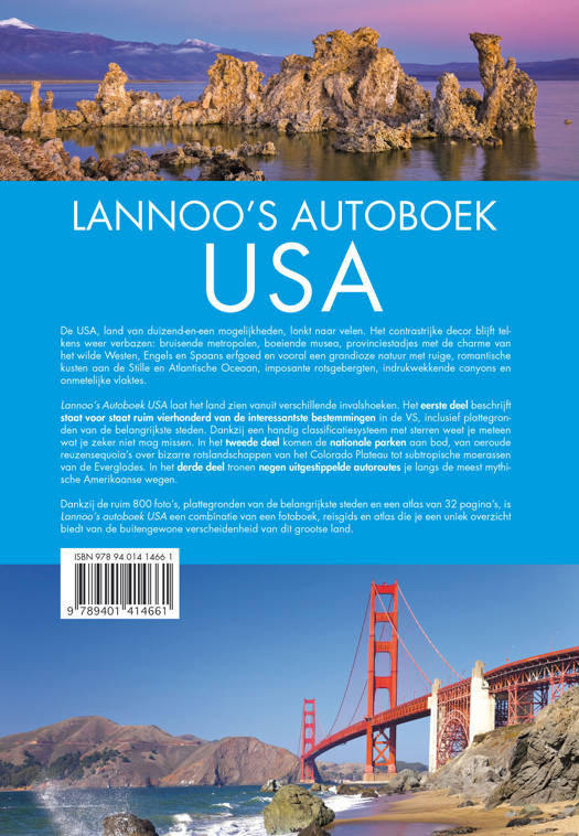 De perfecte combinatie van fotoboek, reisgids én atlas De USA, land van duizend-en-een mogelijkheden, lonkt naar velen. Het contrastrijke decor blijft telkens weer verbazen: bruisende metropolen, boeiende musea, provinciestadjes met de charme van het wilde Westen, Engels en Spaans erfgoed en vooral een grandioze natuur met ruige, romantische kusten aan de Stille en Atlantische Oceaan, imposante rotsgebergten, indrukwekkende canyons en onmetelijke vlaktes. Lannoo’s Autoboek USA laat het land zien vanuit verschillende invalshoeken. Het eerste deel beschrijft staat voor staat ruim vierhonderd van de interessantste bestemmingen in de VS, inclusief plattegronden van de belangrijkste steden. Dankzij een handig classificatiesysteem met sterren weet je meteen wat je zeker niet mag missen. In het tweede deel komen de nationale parken aan bod, van oeroude reuzensequoia's over bizarre rotslandschappen van het Colorado Plateau tot subtropische moerassen van de Everglades. In het derde deel tronen negen uitgestippelde autoroutes je langs de meest mythische Amerikaanse wegen. Dankzij de ruim 800 foto's, plattegronden van de belangrijkste steden en een atlas van 32 pagina's, is Lannoo's autoboek USA een combinatie van een fotoboek, reisgids en atlas die je een uniek overzicht biedt van de buitengewone verscheidenheid van dit grootse land.