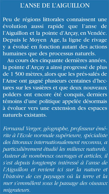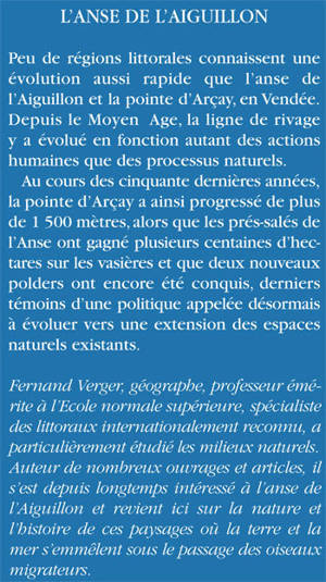 L'ANSE DE L'AIGUILLON Peu de régions littorales connaissent une évolution aussi rapide que l'anse de l'Aiguillon et la pointe d'Arçay, en Vendée. Depuis le Moyen Age, la ligne de rivage y a évolué en fonction autant des actions humaines que des processus naturels. Au cours des cinquante dernières années, la pointe d'Arçay a ainsi progressé de plus de 1 500 mètres, alors que les prés- salés de l'Anse ont gagné plusieurs centaines d'hectares sur les vasières et que deux nouveaux polders ont encore été conquis, derniers témoins d'une politique appelée désormais à évoluer vers une extension des espaces naturels existants. Fernand Verger, géographe, professeur émérite à l'Ecole normale supérieure, spécialiste des littoraux internationalement reconnu, a particulièrement étudié les milieux naturels. Auteur de nombreux ouvrages et articles, il s'est depuis longtemps intéressé à l'anse de l'Aiguillon et revient ici sur la nature et l'histoire de ces paysages où la terre et la mer s'emmêlent sous le passage des oiseaux migrateurs.