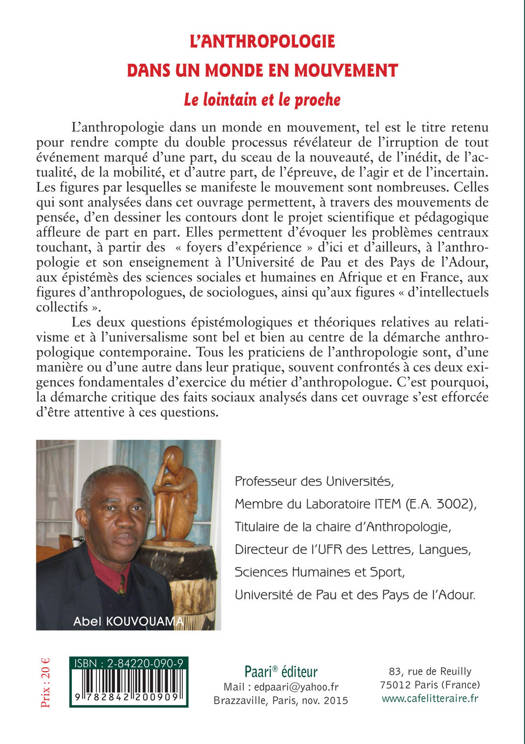 L’anthropologie dans un monde en mouvement, tel est le titre retenu pour rendre compte du double processus révélateur de l’irruption de tout événement marqué d’une part, du sceau de la nouveauté, de l’inédit, de l’actualité, de la mobilité, et d’autre part, de l’épreuve, de l’agir et de l’incertain. Les figures par lesquelles se manifeste le mouvement sont nombreuses. Celles qui sont analysées dans cet ouvrage permettent, à travers des mouvements de pensée, d’en dessiner les contours dont le projet scientifique et pédagogique affleure de part en part. Elles permettent d’évoquer les problèmes centraux touchant, à partir des « foyers d’expérience » d’ici et d’ailleurs, à l’anthropologie et son enseignement à l’Université de Pau et des Pays de l’Adour, aux épistémès des sciences sociales et humaines en Afrique et en France, aux figures d’anthropologues, de sociologues, ainsi qu’aux figures « d’intellectuels collectifs ». Les deux questions épistémologiques et théoriques relatives au relativisme et à l’universalisme sont bel et bien au centre de la démarche anthropologique contemporaine. Tous les praticiens de l’anthropologie sont, d’une manière ou d’une autre dans leur pratique, souvent confrontés à ces deux exigences fondamentales d’exercice du métier d’anthropologue. C’est pourquoi, la démarche critique des faits sociaux analysés dans cet ouvrage s’est efforcée d’être attentive à ces questions.