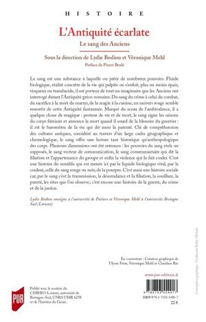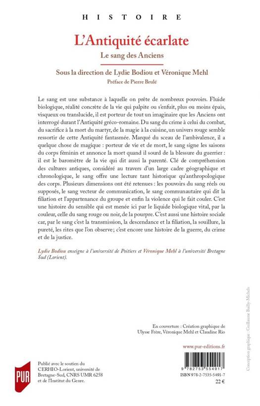 Le sang est une substance à laquelle on prête de nombreux pouvoirs. Fluide biologique, réalité concrète de la vie qui palpite ou s’enfuit, plus ou moins épais, visqueux ou translucide, il est porteur de tout un imaginaire que les Anciens ont interrogé durant l’Antiquité gréco-romaine. Du sang du crime à celui du combat, du sacrifice à la mort du martyr, de la magie à la cuisine, un univers rouge semble ressortir de cette Antiquité fantasmée. Marqué du sceau de l’ambivalence, il a quelque chose de magique : porteur de vie et de mort, le sang signe les saisons du corps féminin et annonce la mort quand il sourd de la blessure du guerrier : il est le baromètre de la vie qui dit aussi la parenté. Clé de compréhension des cultures antiques, considéré au travers d’un large cadre géographique et chronologique, le sang offre une lecture tant historique qu’anthropologique des corps. Plusieurs dimensions ont été retenues : les pouvoirs du sang réels ou supposés, le sang vecteur de communication, le sang communautaire qui dit la filiation et l’appartenance du groupe et enfin la violence qui le fait couler. C’est une histoire du sensible qui est menée ici par le liquide biologique vital, par la couleur, celle du sang rouge ou noir, de la pourpre. C’est aussi une histoire sociale car, par le sang c’est la transmission, la descendance et la filiation, la souillure, la pureté, les rites que l’on observe ; c’est encore une histoire de la guerre, du crime et de la justice.