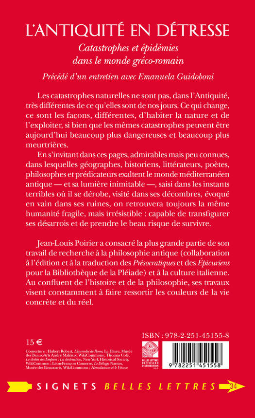 Precede d'un entretien avec Emanuela Guidoboni. Les catastrophes naturelles ne sont pas, dans l'Antiquite, tres differentes de ce qu'elles sont de nos jours. Ce qui change, ce sont les facons, differentes, d'habiter la nature et de l'exploiter, si bien que les memes catastrophes peuvent etre aujourd'hui beaucoup plus dangereuses et beaucoup plus meurtrieres. En s'invitant dans ces pages, admirables mais peu connues, dans lesquelles geographes, historiens, litterateurs, poetes, philosophes et predicateurs exaltent le monde mediterraneen antique - et sa lumiere inimitable -, saisi dans les instants terribles ou il se derobe, visite dans ses decombres, evoque en vain dans ses ruines, on retrouvera toujours la meme humanite fragile, mais irresistible: capable de transfigurer ses desarrois et de prendre le beau risque de survivre.