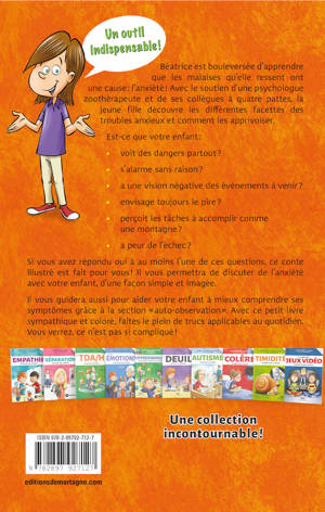 Béatrice est bouleversée d’apprendre que les malaises qu’elle ressent ont une cause : l’anxiété ! Avec le soutien d’une psychologue zoothérapeute et de ses collègues à quatre pattes, la jeune fille découvre les différentes facettes des troubles anxieux et comment les apprivoiser. Est-ce que votre enfant : voit des dangers partout ? S’alarme sans raison ? Envisage le pire dans toute situation ? Perçoit les tâches à accomplir comme une montagne ? A peur de l’échec ? Si vous avez répondu oui à l’une de ces questions, ce conte illustré vous permettra d’aborder l’anxiété avec lui, d’une façon simple et imagée. Aidez aussi votre enfant à mieux comprendre ses symptômes grâce à la section « auto-observation » de ce petit livre sympathique et coloré. Faites le plein de trucs applicables au quotidien afin de surmonter les difficultés liées à l’anxiété. Vous verrez, ce n’est pas si compliqué !