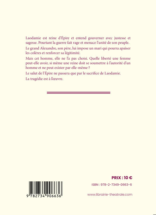 Laodamie est reine d'Épire et entend gouverner avec justesse et sagesse. Pourtant la guerre fait rage et menace l'unité de son peuple. Le grand Alexandre, son père, lui impose un mari qui pourra apaiser les colères et renforcer sa légitimité.