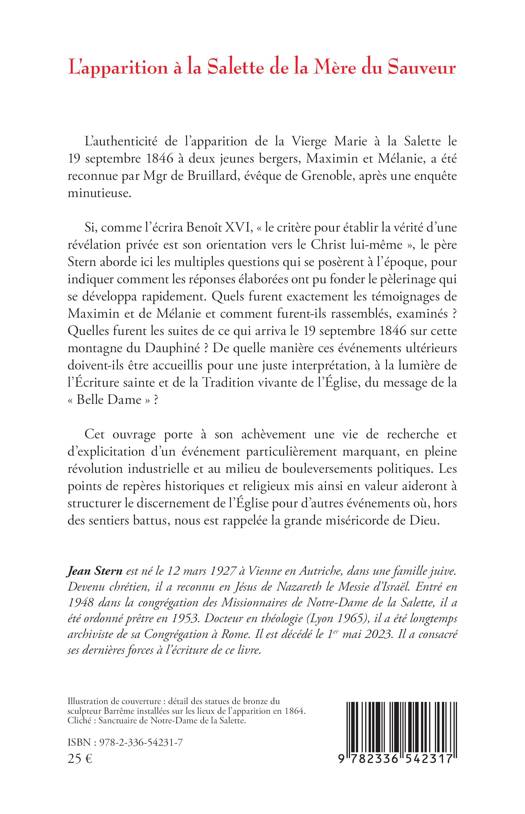 L’authenticité de l’apparition de la Vierge Marie à la Salette le 19 septembre 1846 à deux jeunes bergers, Maximin et Mélanie, a été reconnue par Mgr de Bruillard, évêque de Grenoble, après une enquête minutieuse. Si, comme l’écrira Benoît XVI, « le critère pour établir la vérité d’une révélation privée est son orientation vers le Christ lui-même », le père Stern aborde ici les multiples questions qui se posèrent à l’époque, pour indiquer comment les réponses élaborées ont pu fonder le pèlerinage qui se développa rapidement. Quels furent exactement les témoignages de Maximin et de Mélanie et comment furent-ils rassemblés, examinés ? Quelles furent les suites de ce qui arriva le 19 septembre 1846 sur cette montagne du Dauphiné ? De quelle manière ces événements ultérieurs doivent-ils être accueillis pour une juste interprétation, à la lumière de l’Écriture sainte et de la Tradition vivante de l’Église, du message de la « Belle Dame » ? Cet ouvrage porte à son achèvement une vie de recherche et d’explicitation d’un événement particulièrement marquant, en pleine révolution industrielle et au milieu de bouleversements politiques. Les points de repères historiques et religieux mis ainsi en valeur aideront à structurer le discernement de l’Église pour d’autres événements où, hors des sentiers battus, nous est rappelée la grande miséricorde de Dieu.