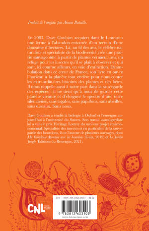 En 2003, Dave Goulson acquiert dans le Limousin une ferme à l'abandon entourée d'un terrain d'une douzaine d'hectares. Là, au fil des ans, le célèbre naturaliste et spécialiste de la biodiversité crée une prairie sauvageonne à partir de plantes vernaculaires, un refuge pour les insectes qu'il se plaît à observer et qui sont, ici comme ailleurs, en voie d'extinction. Déambulation dans ce coeur de France, son livre en ouvre l'horizon à la planète tout entière pour nous conter les extraordinaires histoires des plantes et des bêtes. Il nous rappelle aussi à notre part dans la sauvegarde des espèces : il ne tient qu'à nous de garder cette planète vivante et d'éloigner le spectre d'une terre silencieuse, sans cigales, sans papillons, sans abeilles, sans oiseaux. Sans nous.