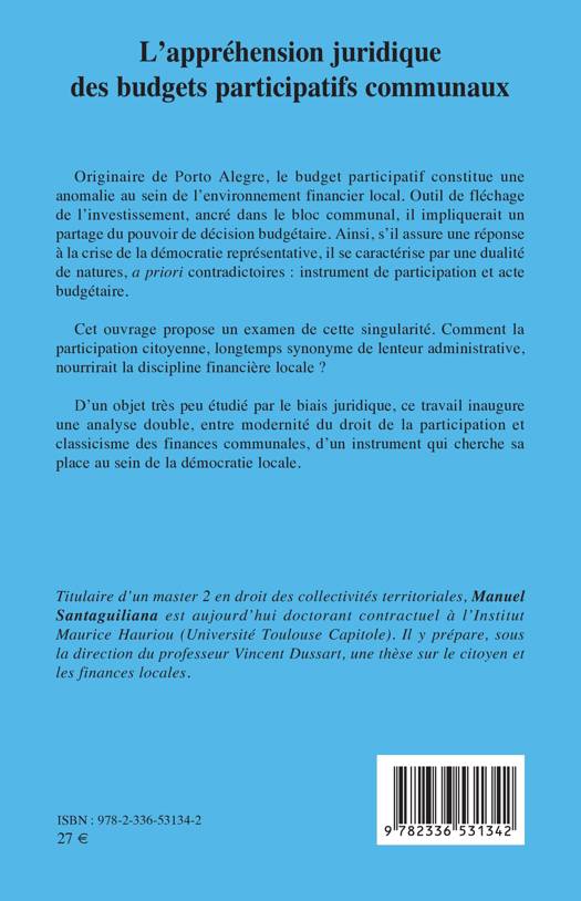 Originaire de Porto Alegre, le budget participatif constitue une anomalie au sein de l'environnement financier local. Outil de fléchage de l'investissement, ancré dans le bloc communal, il impliquerait un partage du pouvoir de décision budgétaire. Ainsi, s'il assure une réponse à la crise de la démocratie représentative, il se caractérise par une dualité de natures, a priori contradictoires: instrument de participation et acte budgétaire. Cet ouvrage propose un examen de cette singularité. Comment la participation citoyenne, longtemps synonyme de lenteur administrative, nourrirait la discipline financière locale ? D'un objet très peu étudié par le biais juridique, ce travail inaugure une analyse double, entre modernité du droit de la participation et classicisme des finances communales, d'un instrument qui cherche sa place au sein de la démocratie locale.