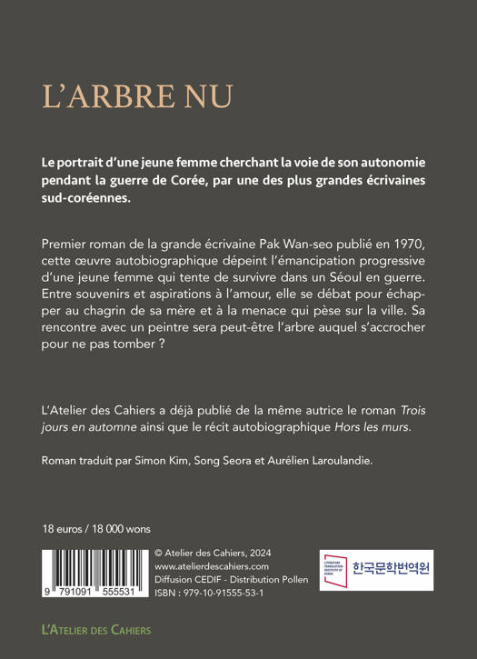 Le portrait d’une jeune femme coréenne cherchant la voie de son autonomie pendant la guerre de Corée, par une des plus grandes écrivaines sud-coréennes.<br /> <br /> Premier roman de la grande écrivaine Pak Wan-seo publié en 1970, cette oeuvre autobiographique dépeint une jeune femme qui travaille dans une boutique de portraits pour les soldats américains. Tourmentée par le sentiment de culpabilité d’avoir perdu ses deux frères lors d’un bombardement, elle souhaite échapper à l’atmosphère sombre de sa maison où sa mère est longée dans le chagrin. Un jour, elle rencontre un peintre et les deux deviennent proches en se promenant dans les quartiers de Séoul. Cependant, leur relation ne dure pas longtemps.<br /> Cette oeuvre décrit la guerre de Corée vécue par une jeune femme qui hésite entre plusieurs choix de vie tout en cherchant une indépendance vis-à-vis de sa mère.<br /> <br /> Park Wan Seo est une écrivaine sud-coréenne née en 1931 qui a publié son premier roman, "l’Arbre nu", à l’âge de quarante ans.<br /> Écrivaine prolifique, elle a écrit 14 romans et 10 recueils de nouvelles au cours d’une trentaine d’années. Une des écrivaines les plus connues en Corée, elle a reçu plusieurs prix littéraires notamment le prix littéraire de Corée et le prix Yi Sang. Elle est appréciée pour sa prose fluide à laquelle s’ajoutent délicatesse et réalisme. Elle peint le quotidien de manière saisissante, avec une franchise étonnante et une empathie non dénuée d’humour. Elle est décédée en 2011.