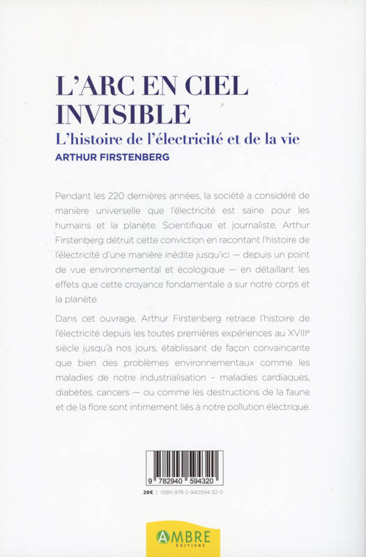 Pendant les 220 dernières années, la société a considéré de manière universelle que l’électricité est saine pour les humains et la planète. Scientifique et journaliste, Arthur Firstenberg détruit cette conviction en racontant l’histoire de l’électricité d’une manière inédite jusqu’ici — depuis un point de vue environnemental et écologique — en détaillant les effets que cette croyance fondamentale a sur notre corps et la planète. Dans cet ouvrage, Arthur Firstenberg retrace l’histoire de l’électricité depuis les toutes premières expériences au XVIIIe siècle jusqu’à nos jours, établissant de façon convaincante que bien des problèmes environnementaux comme les maladies de notre industrialisation – maladies cardiaques, diabètes, cancers — ou comme les destructions de la faune et de la flore, sont intimement liés à notre pollution électrique.