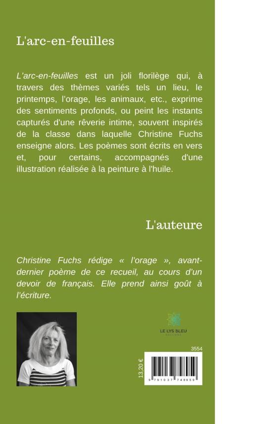 L'arc-en-feuilles est un joli florilège qui, à travers des thèmes variés tels un lieu, le printemps, l'orage, les animaux, etc., exprime des sentiments profonds, ou peint les instants capturés d'une rêverie intime, souvent inspirés de la classe dans laquelle Christine Fuchs enseigne alors. Les poèmes sont écrits en vers et, pour certains, accompagnés d'une illustration réalisée à la peinture à l'huile.