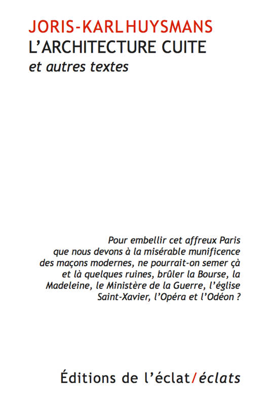 La langue de Huysmans, dont on n'épuisera jamais la richesse, reste le monument le plus pérenne du vieux dix-neuvième siècle, bien plus que la Tour Eiffel, bien plus que le piètre Trocadéro. Et qu'il faut prendre aussi pour ce qu'elle est : une arme acérée contre l'obsolescence programmée de l'homme, comme en témoignent ces écrits sur l'architecture.